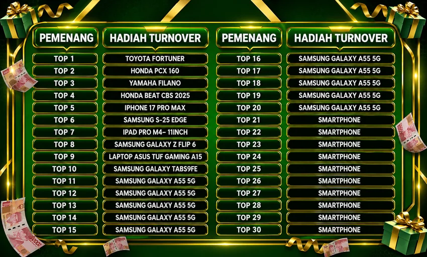 - Peringkat dihitung berdasarkan akumulasi TURNOVER SLOT di periode bulan sebelumnya dan perhitungan TurnOver dimulai dari tanggal 1 pada pukul 00:00 WIB dan berakhir pada pukul 23:59 di Akhir Bulan